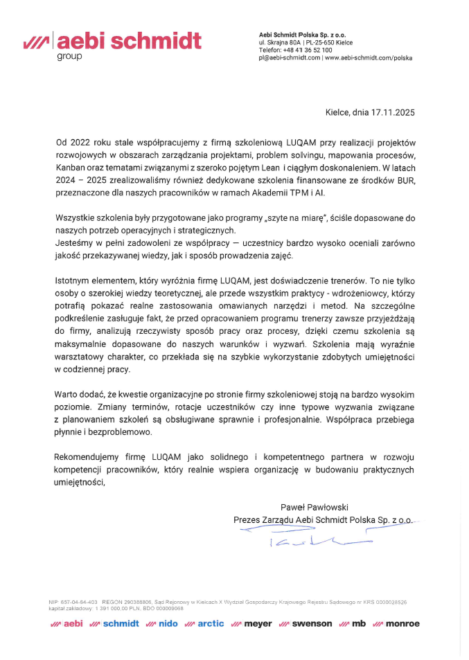 Dzięki wykazanej kreatywności, zdolnościom organizacyjnym oraz umiejętności sprawnego reagowania na pojawiające się potrzeby współpracę z LUQAM możemy z pełną odpowiedzialnością polecić również innym firmom oraz uczestnikom szkoleń.